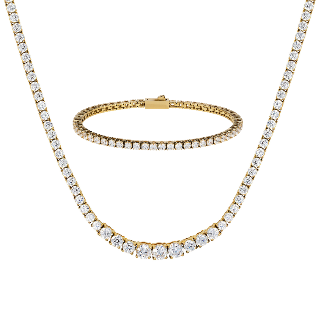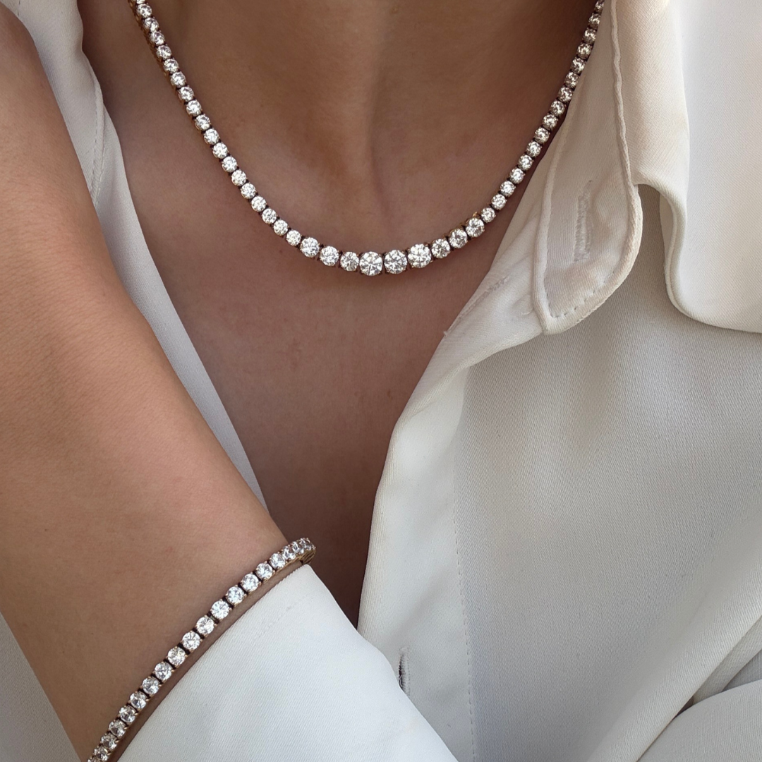 Leonora Tennishalskæden og vores klassiske tennisarmbånd er to tidløse favoritter, der sammen skaber et sofistikeret og iøjnefaldende look.