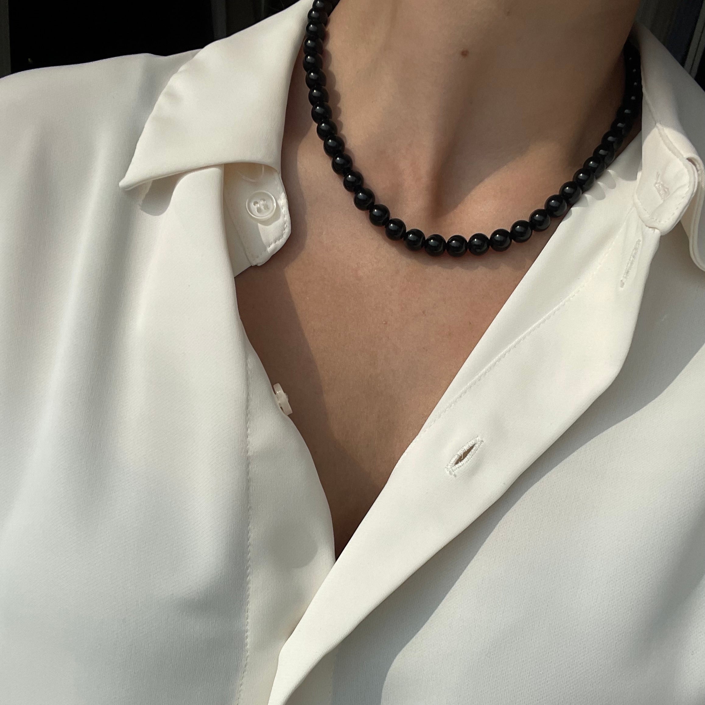 Vores Klassiske perlehalskæde i sort er et tidløst smykke, der tilfører elegance og sofistikation til ethvert outfit. Den kan nemt styles til både hverdagsbrug og særlige lejligheder, og er en uundværlig del af din smykkesamling.