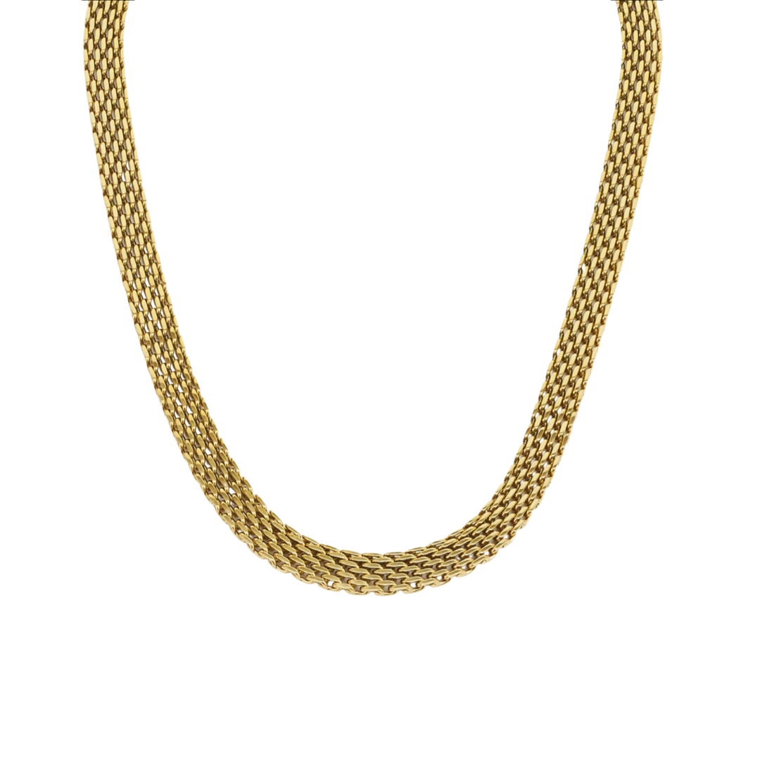 Denne smukke og enkle halskæde har et elegant, fladt design, der lægger sig smukt om halsen og tilfører et sofistikeret præg til ethvert look. Perfekt til at bære alene for et minimalistisk udtryk eller sammen med andre halskæder for et lagdelt look.